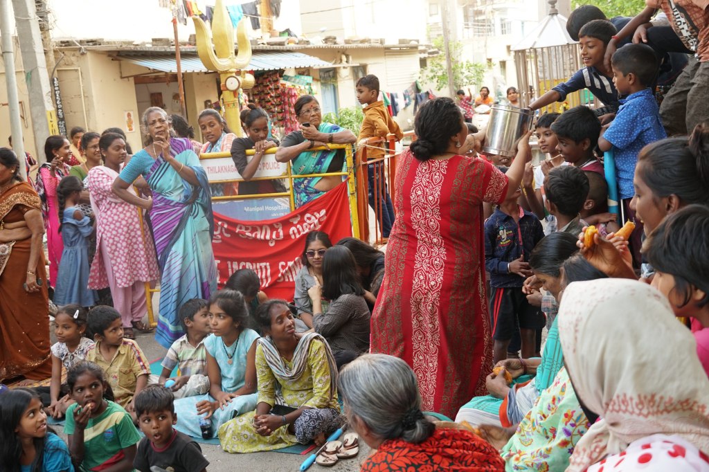 This show happened in the middle of the road. A real tea-shop vandi became our tea shop. We walked through the basti with an army of children singing along with us and convincing all the women and children to join the show. Maraa had organised us the show in collaboration with a domestic workers union.